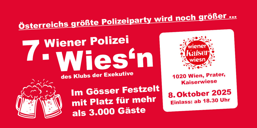 Österreichs größte Polizeiparty wird noch größer… heuer gibt es am 8. Oktober wieder die private Party des Klubs der Exekutive auf der Wiener Kaiser Wiesn im Gösser Festzelt mit Platz für mehr als 3.000 Gäste.